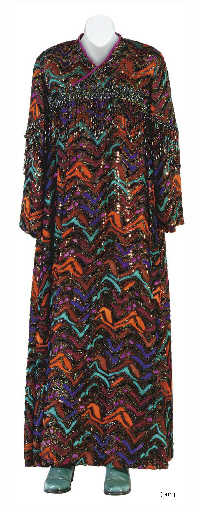 Three elaborate full-length gowns of various colored fabrics embellished with sequins and beads, all with <I>Deep Space Nine</I> label inside inscribed <I>Cecily Adams</I>, all with a corresponding pair of shoes and wardrobe tag -- made for Andrea Martin and Cecily Adams as Ishka, Quark's mother in <I>Star Trek: Deep Space … |