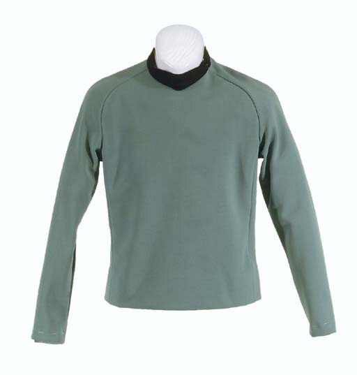A Starfleet uniform shirt of blue polyester doubleknit and black ribbed collar -- designed by William Ware Theiss, made for the third season of <I>Star Trek: The Original Series</I> or <I>Star Trek: Phase II</I> |