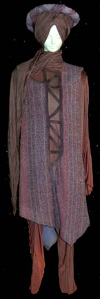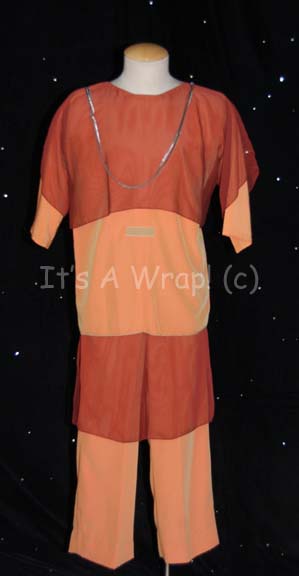 A costume featured in the Star Trek: Voyager episode “Virtuoso”; wherein "The Doctor" (Robert Picardo) becomes an instant celebrity on an advanced planet where music never developed. This costume consists of a long-sleeved, iridescent orange, long tunic with matching trousers, a sheer, dark-rust colored over shirt, a silver-colored tie around … |