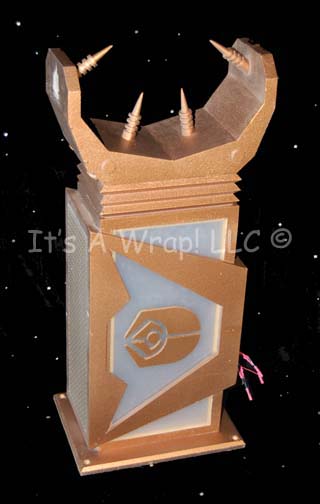 A prop console created for Star Trek episodic television built with a Ferengi theme. The item is made from fashioned wood and painted metallic copper. Two opaque white acrylic panels are mounted on the sides with a Ferengi symbol centered on them. Internal electronics are present with leads for two … |