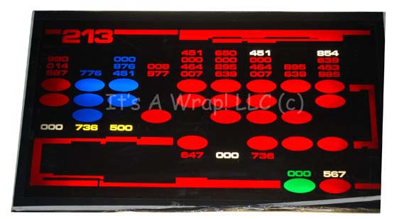 A console computer interface like those appearing variously in Star Trek feature films and occasionally in episodes of Star Trek: The Next Generation. The item is composed of two sheets of clear acrylic with a multi-colored graphical application pressed between and with adhered together edges. The item depicts multiple red … |