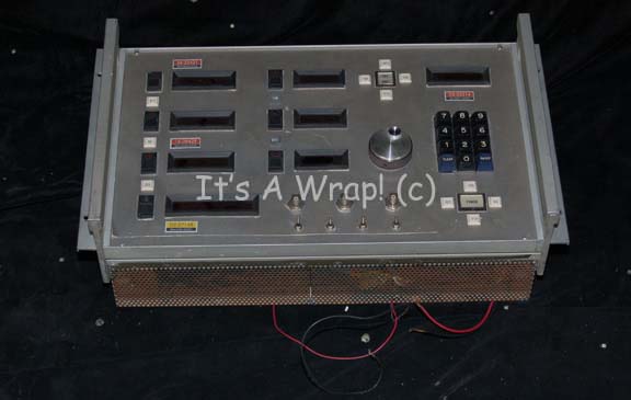 A piece of set dressing removed from a console featured in various episodes of Star Trek: Enterprise. This untested electrical board features multiple functional, and rubber faux buttons, a numbered keypad, a rotating dial, switches, and possible many working lights all set into a board capable of wall or rack … |
