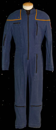 A Starfleet uniform jumpsuit featured in Star Trek: Enterprise for wear by Anthony Montgomery in his portrayal of “Travis Mayweather”. The costume is a blue jumpsuit with gold command division piping around the shoulders, multiple zippered pockets and Velcro size adjustments at the ankles and cuffs, with a zip up … |