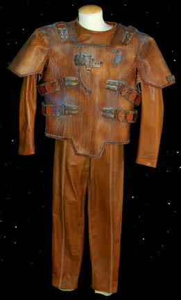 A two-piece Bajoran-style suit, comprising: a jacket of brown wool, with bajoran communicator pin, with matching pants, belt and boots, the suit with <I>Deep Space Nine</I> label inside inscribed <I>Rene Auberjonois</I>; with corresponding wardrobe tag -- made for Rene Auberjonois as Odo in <I>Star Trek: Deep Space Nine</I> (5) |