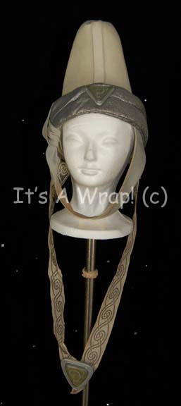 A costume element of the style featured in “Search for Spock” and “The Voyage Home”. This item is a white, felt, Vulcan-style hat featuring textured, metallic-silver trim, and further gray trim forming a chinstrap, an attached necklace with gold-colored stripes in spiral and interlocking patterns. On the front of the … |