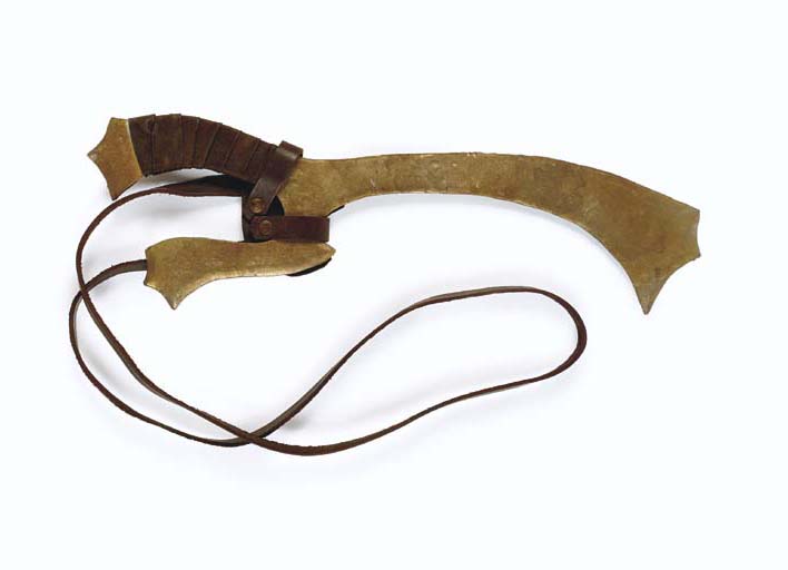 A Klingon knife made for use in Star Trek episodic television. Made of foam rubber the knife is painted black and brown, has faux spikes at the top of the hilt, many textured along the front and back, a small Klingon symbol near the bottom and, on the reverse side, … |
