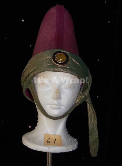 A costume element similar to those featured in various Star Trek feature films. A magenta-colored, Vulcan-style, felt hat featuring metallic-gold trim with a green tinge that also forms a chinstrap; a round, yellow faux jewel in the front with Vulcan iconographic symbol in the middle and dark-blue trim. A sewn … |