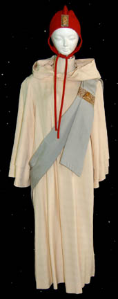 A costume similar to those featured in various instances in the Star Trek Original Series style feature films. This costume consists of a long-sleeved, full-length, off-white robe featuring wide, pleated sleeves, a sewn in hood on the back, a gray, ceremonial sash featuring a metallic silver-colored inset with gold-stitched glyphs; … |