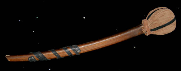 An approximate 37.5 inch stained wood instrument with a slight curve and a leather padded end. The grip features a black leather wrap around it that is bolted into the wood. This may be either a large drum stick for striking a gong or it could be a stunt weapon. |