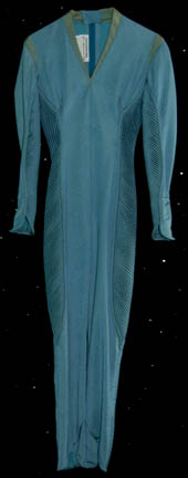 The ‘Ellora' were a primitive race that appeared in the Star Trek: Insurrection feature film as the indentured servants to the more powerful ‘Son’a’. This jumpsuit was worn by an Elloran officer serving on board the Son’a “Ru’afo’s” (F. Murray Abraham) flagship. Made of blue velvet, the jumpsuit has black … |