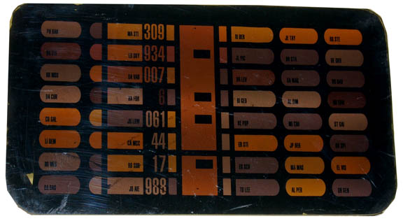 A piece of set dressing believed to have been used in various episodes of Star Trek: The Next Generation. The item is a rectangular shaped piece of smoked acrylic with graphical applications adhered to the reverse. Used as background in various scenes, when these LCARS (Library Access and Retrieval System) … |