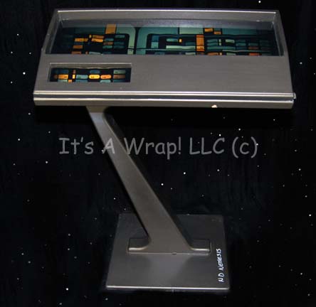 A computer console set piece featured in Star Trek X: Nemesis as part of the “U.S.S. Enterprise-E” sets. The item is made from fashioned wood with acrylic console interface panels, and working internal electronics, and a vacuum formed face. The item is powered by a single type-B three prong plug … |