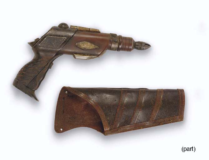 Three prop weapons made from solid cast resin, painted with simulated rust and dust, including three leather holster clips -- <I>14in. long</I> -- used in "Marauders" in <I>Star Trek: Enterprise</I>; and a three-bladed Klingon d'k tahg knife made from rubber with vacuum-formed plastic handle, heavily aged with simulated rust and … |
