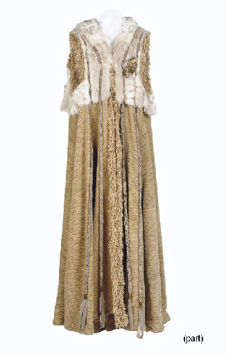 Two costumes, comprising: an elaborate gown of textured herringbone faun wool, trimmed with off-white imitation fur and lengths of plaited imitation suede, adorned with a metal ceremonial badge; and a green suede jacket with imitation grey fur sleeves, and a sash of purple and green patterned silk, with brass trims … |
