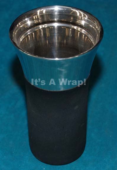 A set dressing cup like those appearing in the Star Trek: Enterprise episode “Cold Front” in the “Crewman Daniels” (Matthew Winston) crew quarters set. The item is a tall polished metal cup with a black rubber grip around the outside. The lip of the cup flows outward near the top … |