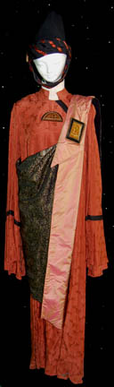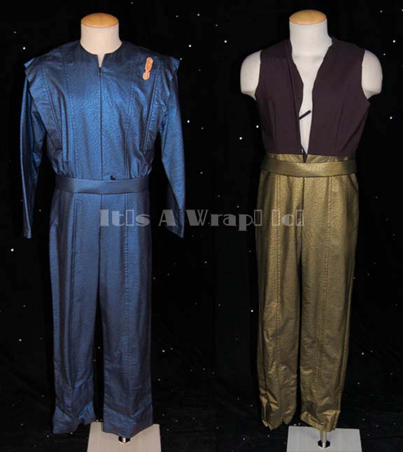 A costume similar to those featured in various episodes of Star Trek: Deep Space Nine. This costume consists of a light-green, silk-like shirt with zips on the sides and matching, short pajama trousers with a textured design. A sewn in Deep Space Nine tag reads ‘Avery Brooks’ and a costumer’s … |