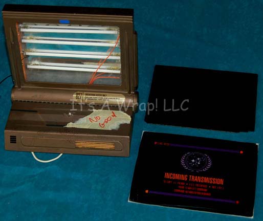 A damaged ‘computer’ prop located in its current condition believed to have appeared in a Star Trek feature film starring the Next Generation cast. The item is made from molded resin with two acrylic ‘display screens’, one smoked, the other opaque white with a graphical application adhered to it. The … |