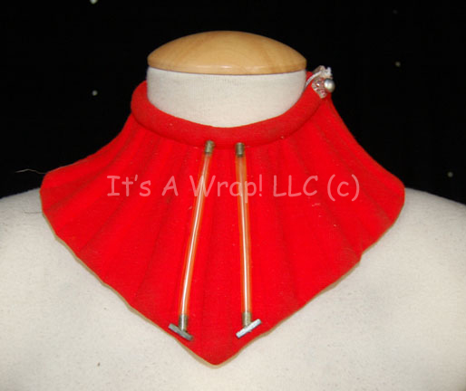 A of costume accent for a Starfleet engineer’s white radiological suit appearing variously in Star Trek feature films from Star Trek II: The Wrath of Khan through Star Trek VI: The Undiscovered Country. The item is a red colored fabric collar made for wear on a corresponding trainee costume uniform. … |