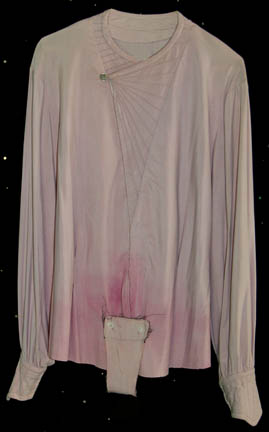 A costume shirt featured in Star Trek III: The Search for Spock, recognizable as the style appearing on William Shatner in his portrayal of “Admiral Kirk”. The shirt is a pink colored, long sleeve, diagonal zip front shirt with a silver colored button at the top, with a fanned out … |