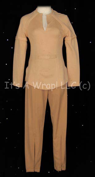 A costume featured in the first Star Trek feature film. This costume is a tan, Class-A, Starfleet uniform consisting of a long-sleeved shirt, matching trousers, and shoes with leggings sewn onto them. The lot comes with these unattached items; Medical light-green shoulder division strips with a gold triangle denoting the … |