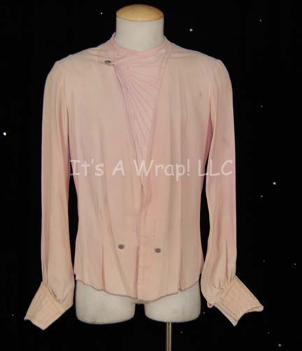 A costume top featured in Star Trek IV: The Voyager Home for wear by William Shatner in his portrayal of “Admiral Kirk”. The shirt is salmon-colored with an asymmetrical front that snaps diagonally up the right side and loops around a silver-colored button at the top. The cuffs feature Velcro … |