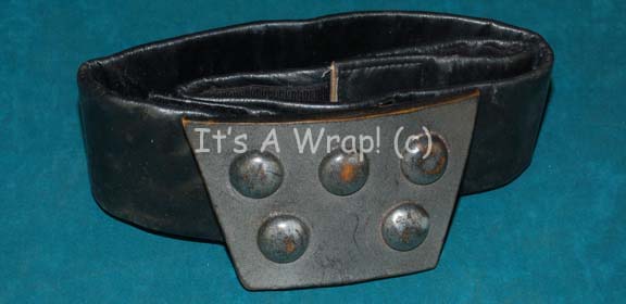 A costume accessory appearing in Star Trek feature films and episodic television – a Klingon belt and buckle. The belt is black vinyl featuring a resin buckle painted metallic silver with five ‘studs' that have the remains of metallic gold paint on them and a pair of wire loops molded … |