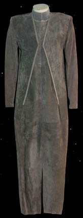A costume featured in the Star Trek: The Next Generation episode “The Outcast” worn by an androgynous alien ‘J'Naii Judge’. The costume is a light gray suede jumpsuit with a dickie, a hood, and boots. The costumer’s tag reads ‘The Outcast, J’Naii Judge’. |
