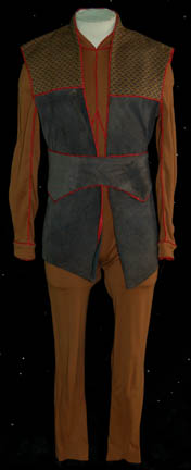 This costume was featured in the Star Trek: Voyager episode “Sacred Ground”. It has a tan tunic with ruffled sleeves, pleats up the front and back and an attached sash that snaps at the side. Matching tan pants accompany the tunic, as does a braided belt with tassels. Costume comes … |