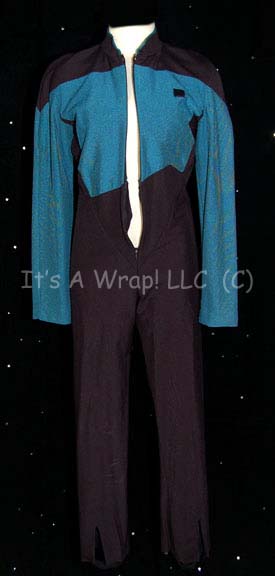 A costume featured in various episodes of Star Trek: The Next Generation. This costume is a TNG-style Starfleet uniform consisting of a long-sleeved, full-length black jumpsuit featuring Sciences Blue division colors along the chest, back, both sleeves, and as piping around the collar; a Velcro patch for a commbadge (not … |