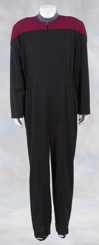 (Paramount-TV, 1994-2001) Black and maroon Starfleet duty uniform with grey undertunic and detachable shoulder pads, worn by John de Lancie in his role as “Q.” Both garments include internal Voyager labels marked <em>“John de Lancie”</em>. Also included are original costumer’s tags marked <em>“Show #265 ‘Q2’”</em> indicating the costume was used … |
