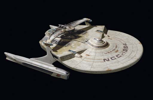 A small model of <I>Starship Reliant</I>, the model made from <I> Enterprise</I> model kit parts with additional custom-made vacuum-formed parts, well-detailed by the Industrial Light And Magic model shop, with one extra engine nacelle and extra "roll bar" with lesser battle damage -- <I>17x10x4in. </I> -- used in visual effects … |