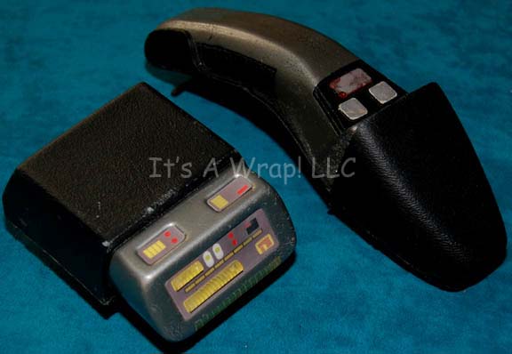 A pair of props featured variously in Star Trek episodic television for use by characters in Starfleet or the Federation, a tricorder and phaser, both molded into holsters. The items are intended to appear as though they can be removed and used, but were not the hero props for the … |