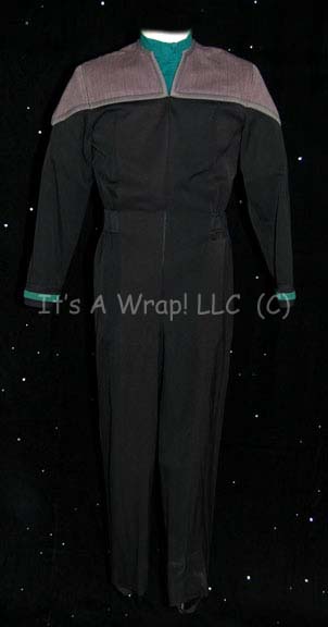 A costume featured in various episodes of Star Trek: The Next Generation. This costume is a Starfleet uniform jumpsuit and features black shoulders with an Operations Gold chest, back, sleeves, and as piping around the Mandarin collar; black waist and legs that end in stirrups, a zip down the front, … |