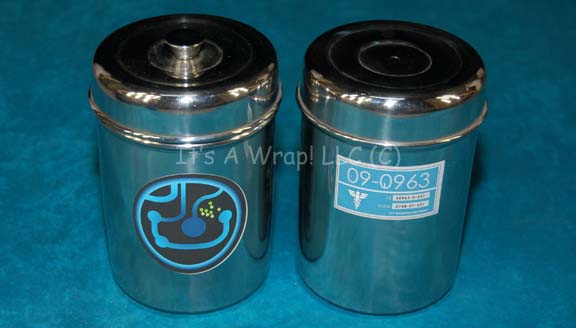 A pair of polished metal containers featured as set dressing in the sickbay set on Star Trek: Enterprise. The items are matching in size and shape, one features an alien themed graphical application, the other a Starfleet inventory application, they both feature pull away lids. Measures approx. 5.5 X 3.5 … |