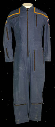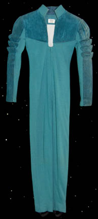 A costume featured in the Star Trek: Enterprise episode “Detained” for wear by “Lt. Reed” (Dominic Keating) while masquerading as a Suliban prisoner in a Tandaran concentration camp. The costume is a brown suede jumpsuit with two dark blue knit tops and a brown leather belt with a keep. The … |