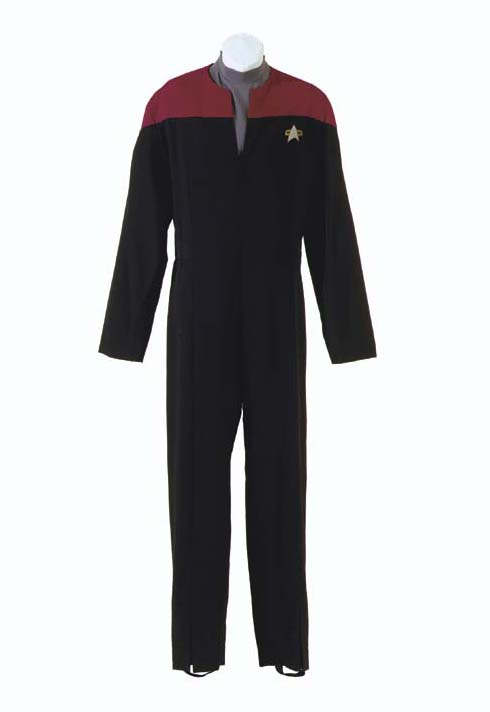 A black and burgundy Starfleet uniform jumpsuit, with Starfleet communicator badge and with grey undershirt, both with <I>Deep Space Nine</I> label inside inscribed <I>Avery Brooks</I> or <I>AB</I>; with corresponding wardrobe tag -- made for Avery Brooks as Captain Ben Sisko in <I>Star Trek: Deep Space Nine</I> (2) |