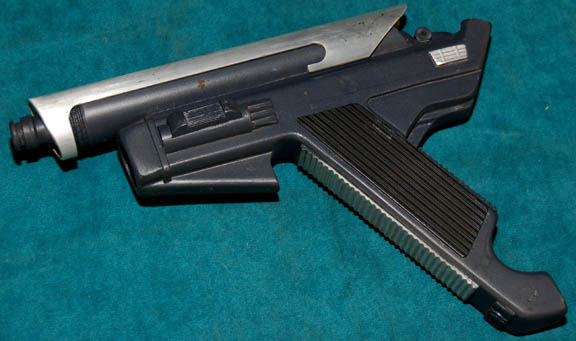 A prop item featured in the Star Trek: Enterprise episode “Fallen Hero”; wherein the “Enterprise NX-01” is directed to transport a Vulcan ambassador who is being expelled from the world she was serving on for “criminal misconduct”. This item is a dark-gray, cast resin pistol featuring textured black accents on … |
