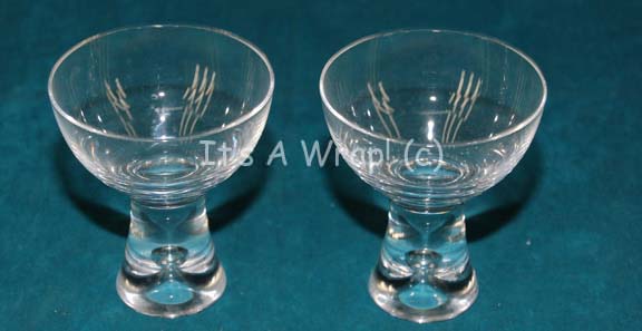 A pair of glasses like those featured variously in Star Trek feature films and episodic television. These glasses have weighted bases that feature a ball-like cavity for aesthetics and a wide lipped drinking basin. They measure just over 3.75 inches tall with a 3.25 inch diameter. |