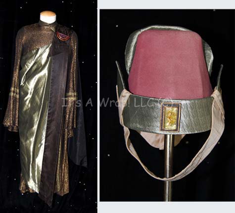 A costume of the style featured in various Star Trek feature films. This costume consists of a long-sleeved, full-length black robe featuring a metallic-gold floral pattern, open, bell-sleeves, and a lighter color of gold in stripes around the cuffs, collar, and down the front. A beautiful metallic-sage colored, over the … |