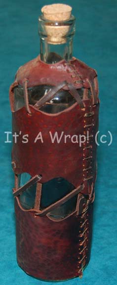A prop item like those featured in Star Trek feature films and episodic television. This item is a tall, clear, glass bottle featuring a brown, textured, faux leather cover in several pieces but tied and secured together with real leather laces. A cork is in the top of the bottle … |