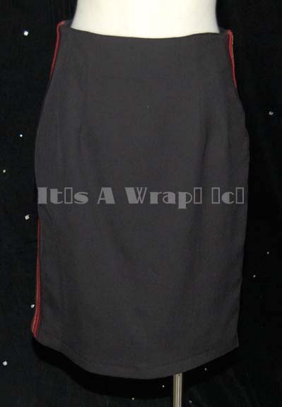 A costume element like those featured in Star Trek VI: The Undiscovered Country and possibly in the opening sequences of “Generations”; a black skirt featuring wide, red stripe down the side and thin, gold piping down the middle of the stripe. The gold piping denotes flag admiral rank. A sewn … |