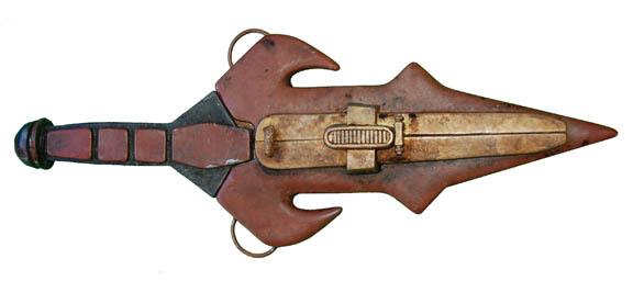 A cast rubber prop knife painted metallic bronze to give it an aged or rusty appearance. The sheath is formed plastic painted to look aged with attachments for the leather ties. Klingon knives like this have been seen in many Star Trek feature films like ‘Star Trek III: The Search … |