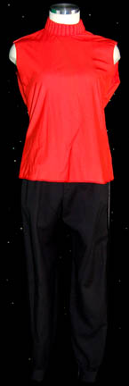 Almost a whole costume, these components are the style of uniform appearing throughout the Star Trek Feature films. The costume is black Starfleet uniform trousers with gray division stripes for the outside, a red short sleeved undershirt with a ribbed collar, and corresponding trainee division strips; a gold trimmed black … |