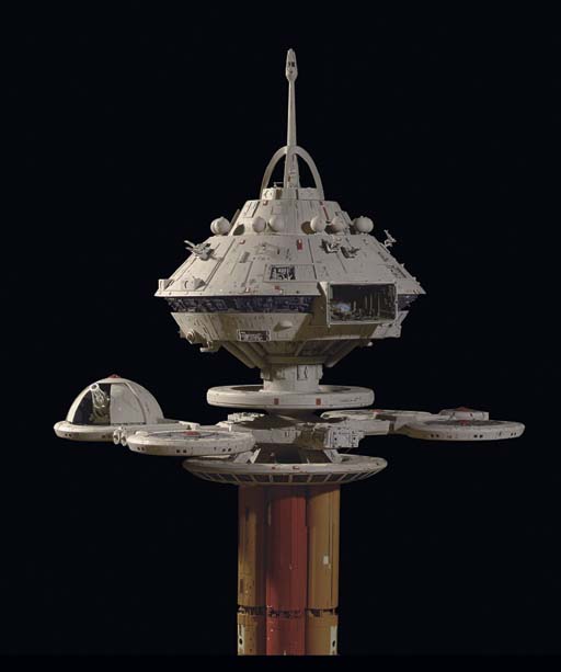 A mushroom-shaped space station model with secondary disk-shaped modules made of acrylic plastic, cast resin, with styrene details, "Botanical section" ring has separated from main model and lower tanks are loose, with two power supply boxes [untested], with floor stand -- <I>36x23x59in.</I> -- originally seen as the space office complex … |