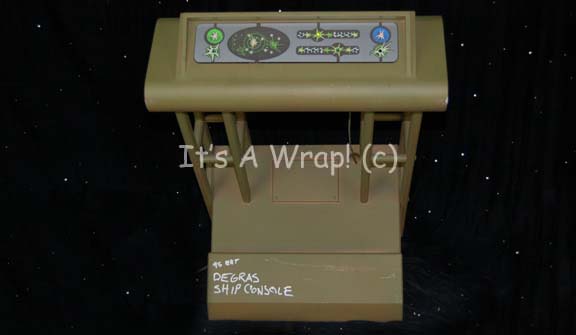 A green painted fashioned wood set dressing console appearing in the Star Trek: Enterprise episode “The Council”. The item was part of the set interior of “Degra’s” (Randy Oglesby) landing shuttle and features currently non-functional interior lighting, but a sheet plastic panel that is embedded into the console face that … |