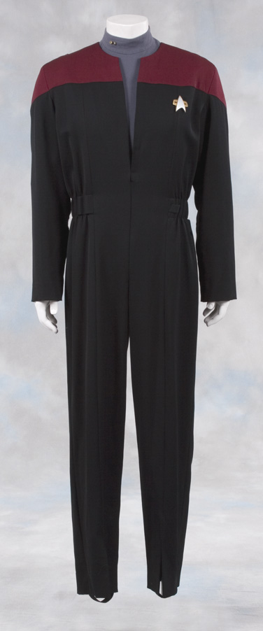 | A Starfleet uniform made in the style of Star Trek: The Next Generation featuring the black shoulders with a command red chest and back and black waist and legs that end in stirrups. This style also exhibits the Mandarin collar common to cast members during and after the third season … |