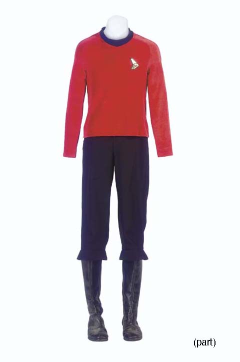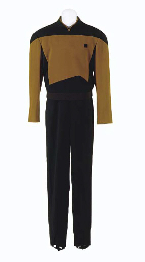 A black and gold Starfleet uniform jacket and pants; and a <I>Star Trek: Voyager</I>-style Starfleet uniform jumpsuit with grey undershirt, the shirt, jacket and jumpsuit with <I>Deep Space Nine</I> or <I>Paramount</I> label inside inscribed <I>Colm</I> or <I>Colmeany</I> [sic]; with two corresponding wardrobe tags -- made for Colm Meany as Miles … |