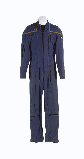 A blue <I>NX-01</I>-style jumpsuit with mustard shoulder stripes, embroidered <I>Enterprise</I> mission patch, and black undershirt, identified by sewn-in label inscribed <I>Anthony Montgomery</I> -- worn by Anthony Montgomery as Ensign Mayweather on <I>Star Trek: Enterprise</I> (2) |