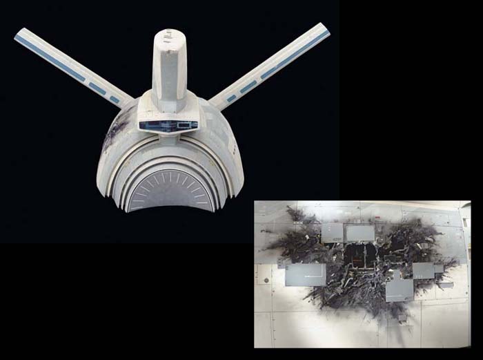 An enlarged model of part of the <I>Starship Enterprise</I>'s photon torpedo tubes with part of the cigar-shaped Engineering hull and interconnecting neck, with lower part of the warp engine nacelle struts -- <I>48x24x27in.</I> -- made for <I>Star Trek III: The Search For Spock</I> |