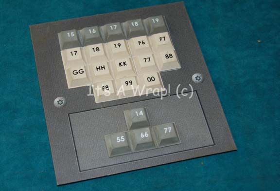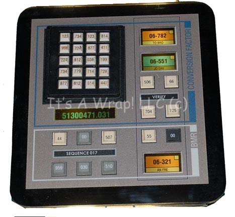 A piece of set dressing like those seen in Star Trek: Enterprise episodes like “First Flight” or “Terra Prime”. This item is sheet plastic featuring a graphical application adhered to the front and multi-colored, rubber, faux buttons with alpha-numeric values. The item measures approx. 6 X 6.5 inches. |